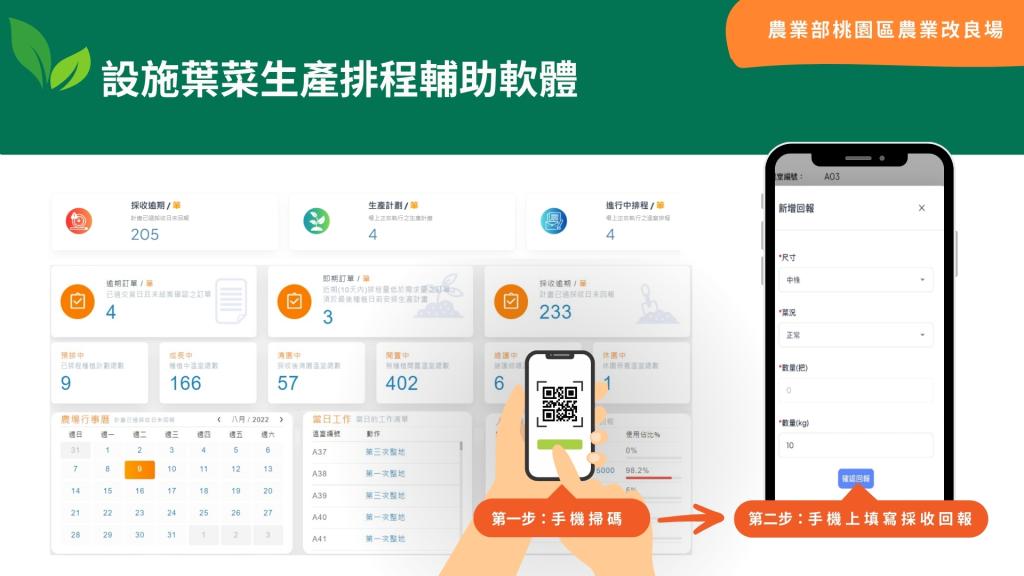 其中,農業部桃園區農業改良場在會場上介紹自家開發的「設施葉菜生產排程輔助軟體」,該方案在一個擁有1000棟溫室的農場進行長達兩年的試驗,能協助農場快速進行訂單分配、作業調度及產量預估,並結合影像辨識技術與自動派工系統,即時掌握作物生長狀況並自動生成作業建議。農業部桃園區農業改良場助理研究員洪巍晉表示,目前已有5間農場在使用這套系統,並且完成了三個技轉案,其中接受技轉的資服業者正著手為潛在農場客戶提供月租式的客製化雲端服務。
