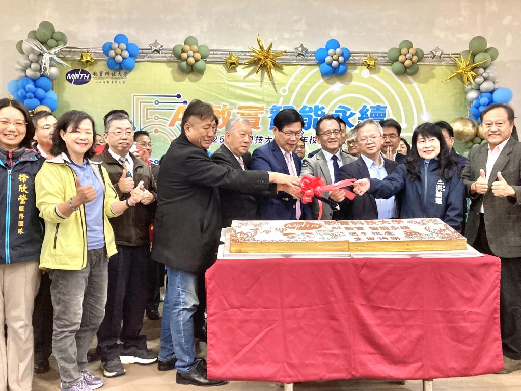 ▲敏實科大舉行五週年校慶典禮,曾信超校長和與會貴賓一同切蛋糕慶祝。