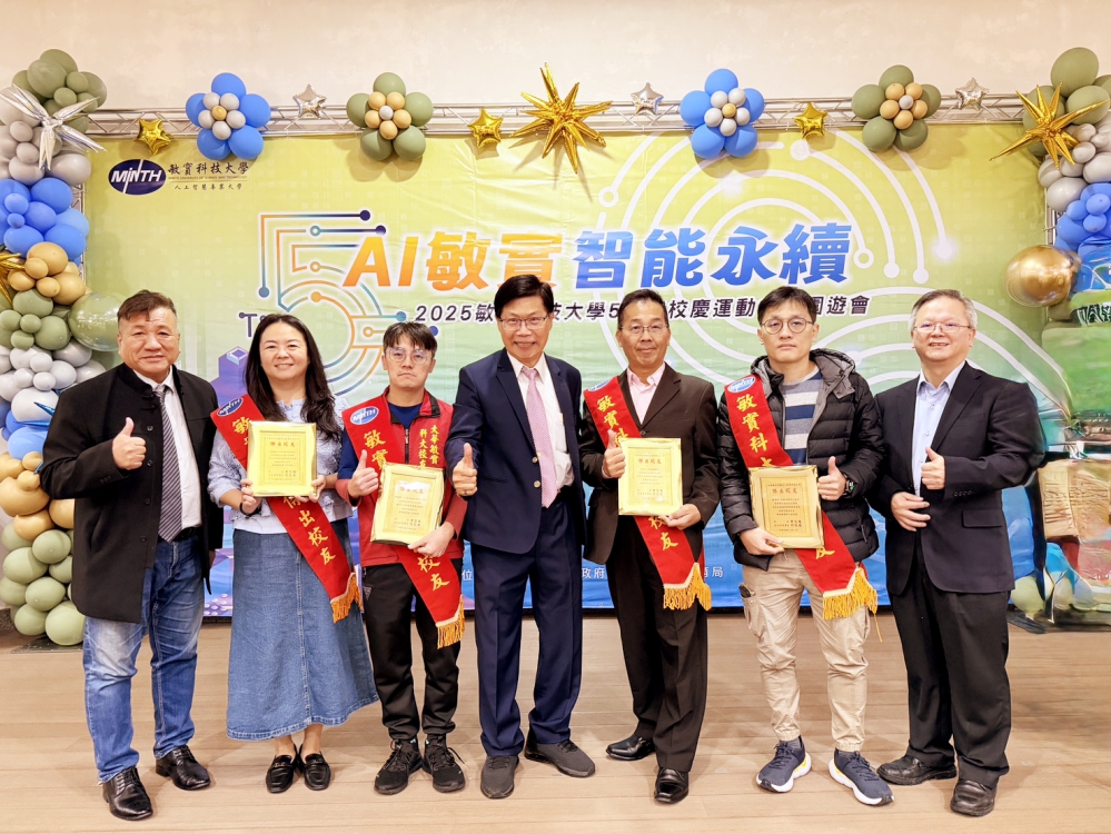 ▲敏實科大舉行五週年校慶典禮,曾信超校長(中)和與會貴賓們合影,並正式宣告敏實科大邁入「AI Agent 大學」新紀元!
