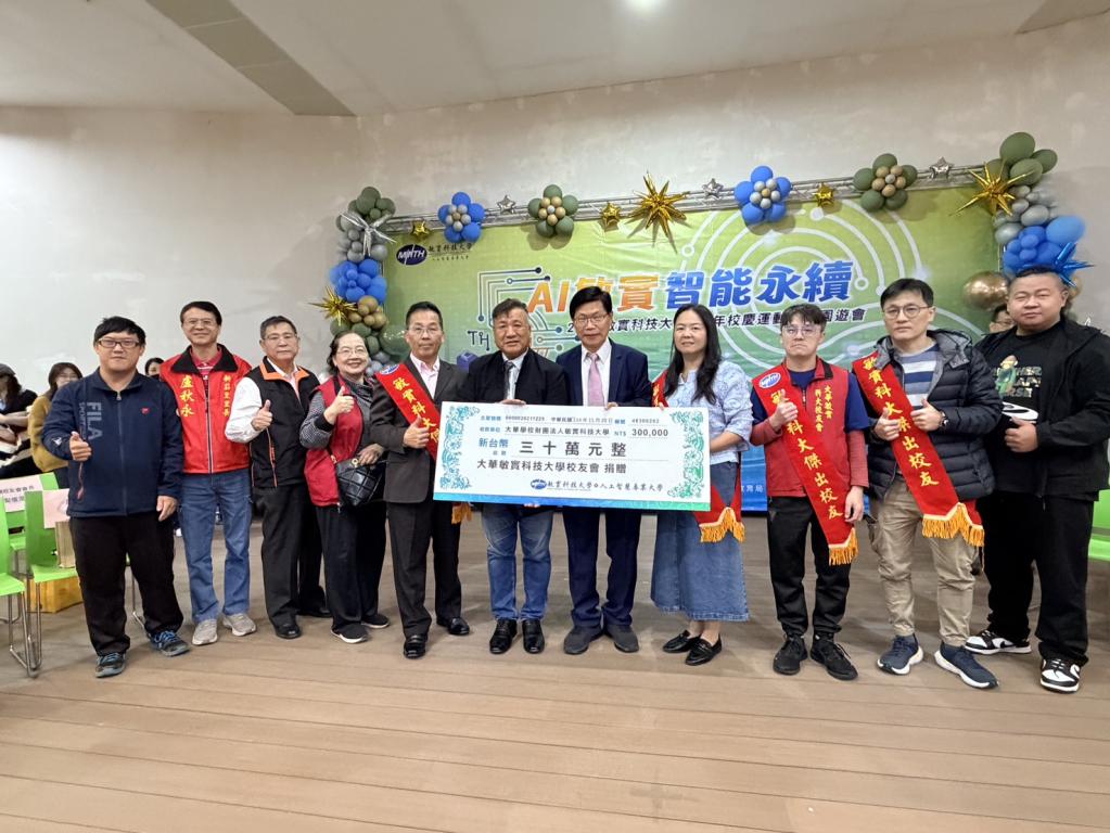 ▲敏實科大五週年校慶典禮並舉行敏實科大校友會捐贈30萬元儀式。敏實科大校長曾信超校長(右5)、敏實科大校友會理事長彭俊橙(左6)和傑出校友及與會貴賓一同合影。(圖/敏實科大提供)