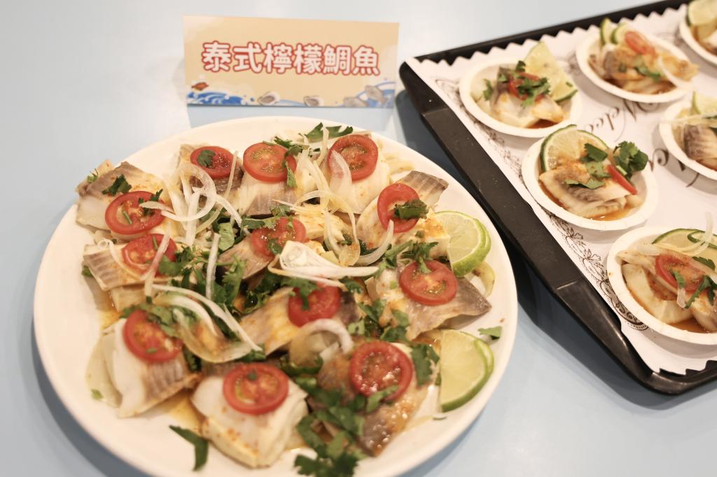 農業局特別邀請嘉南藥理大學王明煌老師示範「黃金鯛魚塊佐檸檬奶油醬」、「翡翠虱目魚蒸蛋」兩道料理,並由南科員工餐廳廚師搭配廠商加工品烹調6道佳餚,包括鳳梨珍鯛、泰式檸檬鯛魚、脆皮鮮蚵、咕咾虱目魚塊、大埤酸菜蚵、三杯虱目魚等,色香味俱全,獲得現場好評。