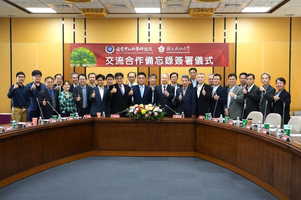 簽約儀式下午13時於光復校區雲平大樓 4 樓會議室舉行;沈孟儒校長、中科院李世強院長代表雙方簽署;成大張始偉副校長、沈聖智教務長、劉全璞研發長、謝孫源國際長及相關學院師長以及中科院林高洲副院長、策略會蔡嘉芳副執行長、飛彈所吳典黻所長、材料所翁炳國所長、電子所白鎧豪所長等一行主管,共計近30位出席觀禮。
