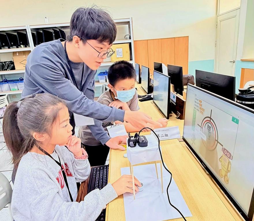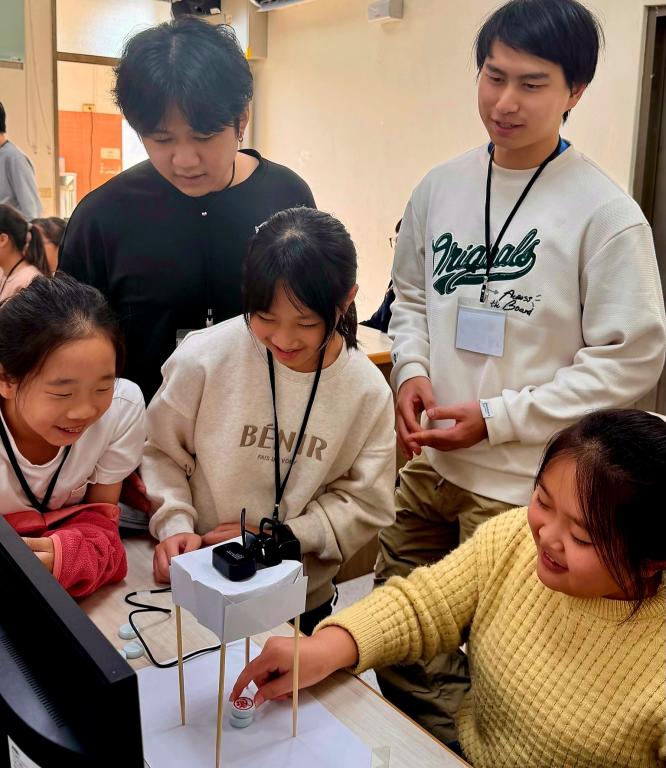 校方表示,本次活動仰賴電機系與社工系師生跨領域合作完成,參與學生包括電機系吳琝貴、謝永傑、蔡昇宏、陳熠、黃峻凱、社工系張芮綺同學,他們透過「手把手」教導與陪伴,不僅激發學童對AI好奇心與探索慾望,也增進自身未來職場上所需跨領域合作溝通協調等就業力。(金門大學提供照片)