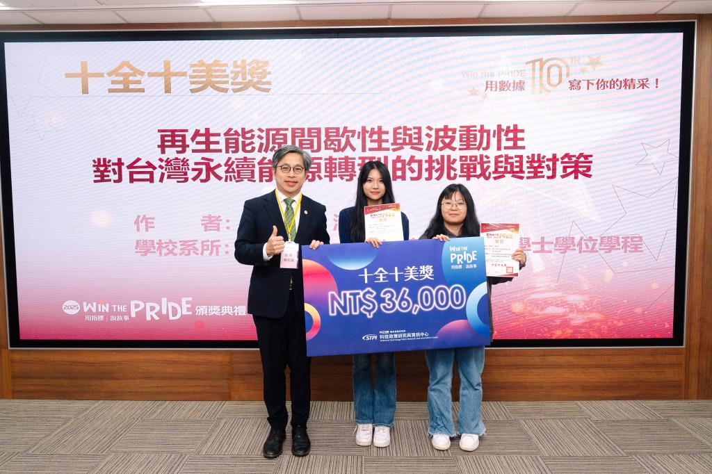 國家實驗研究院科技政策研究與資訊中心(國研院科政中心)辦理的2025「Win the PRIDE:用指標說故事」競賽頒獎典禮暨十周年回顧於12/20日隆重登場,其中為十周年特別設立的「十全十美大獎」,經激烈角逐最終由林佩潔、洪莙茹(國立中興大學智慧創意工程學士學位學程)之《再生能源間歇性與波動性對台灣永續能源轉型的挑戰與對策》奪下。