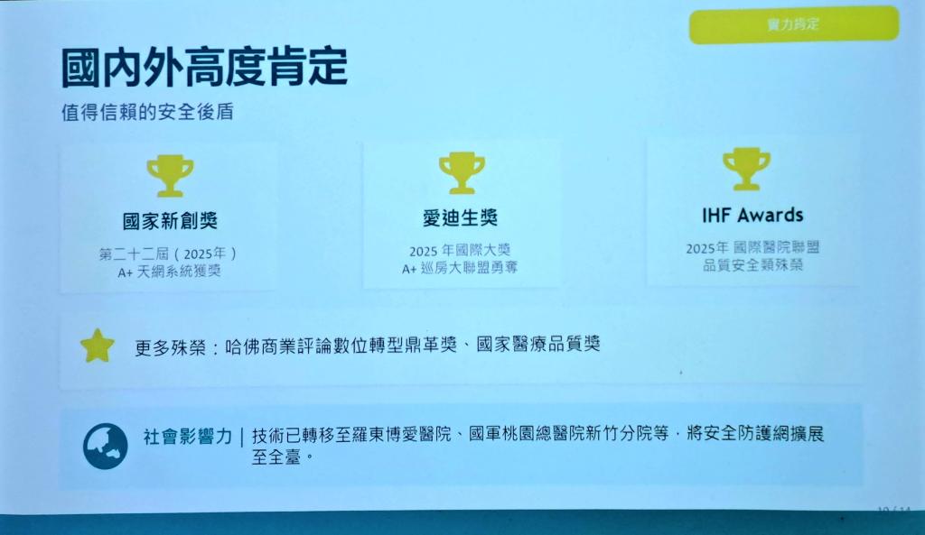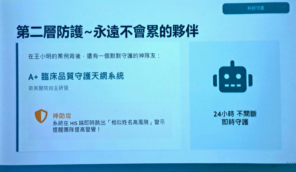 除了人為核對,奇美醫院更導入科技創新;奇美醫院運用生成式AI技術自主開發「A+臨床品質守護天網系統」,整合臨床數據與即時提醒機制,協助醫療團隊在第一時間掌握風險訊號,強化風險與安全管理效能;這項創新不僅榮獲2025年第22屆「國家新創獎」肯定,另一項「A+巡房大聯盟」HIS Copilot更勇奪2025年「愛迪生獎」。