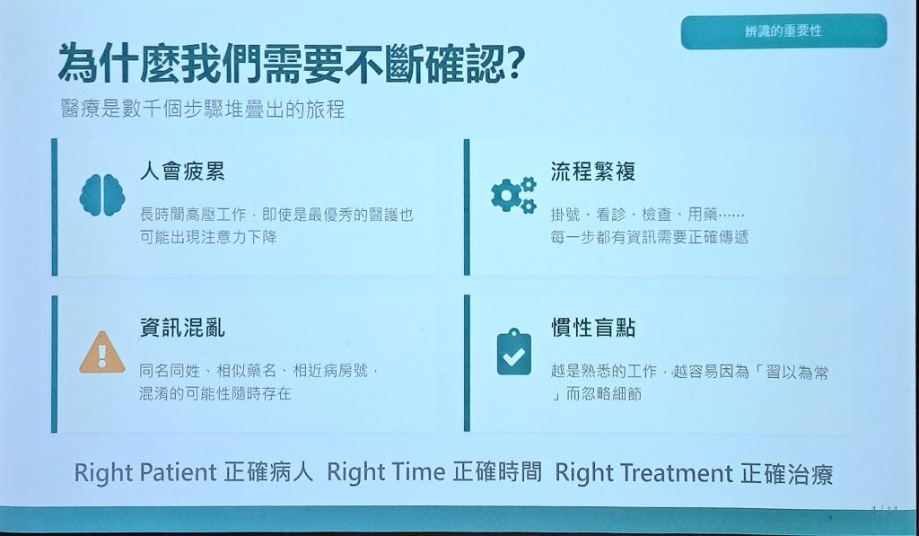 奇美醫院品質管理部醫療安全科執行秘書楊翼寧強調,「辨識」不僅止於病人身分確認,更涵蓋用藥、檢查、治療與各項處置前的再次核對。因此,楊醫師也鼓勵民眾就醫時可以「主動問」、「主動說」和「主動確認」,與醫療人員共同確認自己身份辨識及醫療處置;透過標準化流程,確保「對的人、在對的時間、接受對的治療」,讓民眾能更清楚理解自己醫療處置計畫與照護過程,降低不確定感,進而提升就醫安心感。