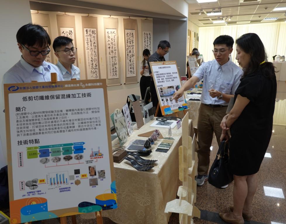 「技術成果區」彰顯法人研發硬實力,展示超臨界發泡與拉脹結構技術,打造極輕量且無毒防護材料,並透過T/OP異質分離、聚酯脫色及碳纖維微波熱裂解技術實現廢料高值化再製,驅動產業邁向數位淨零與永續轉型新紀元。