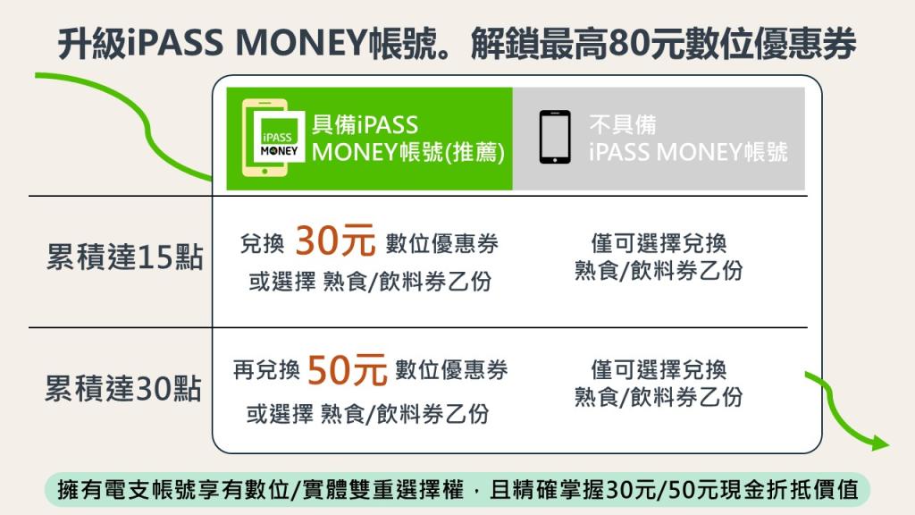 此外,本次數位通行機制由臺南市政府首次發想並示範,結合iPASS MONEY推出數位通行與多重優惠措施,鼓勵民眾踴躍參與並響應綠色永續;民眾只需綁定電支帳號並完成現場報到,每日可獲得50點「一卡通綠點」,可用於後續折抵大眾運輸及生活消費;參與展區互動亦可累積點數,集滿15點可兌換30元數位優惠券(或實體熟食/飲料券),集滿30點可再兌換50元數位優惠券(或實體熟食/飲料券),每人每日最高可兌換80元優惠;該數位優惠券於現場搭配iPASS MONEY消費使用,可折抵部分金額,折抵金額將於隔日回饋至帳戶,亦可於活動後在臺南市指定合作店家持續使用。