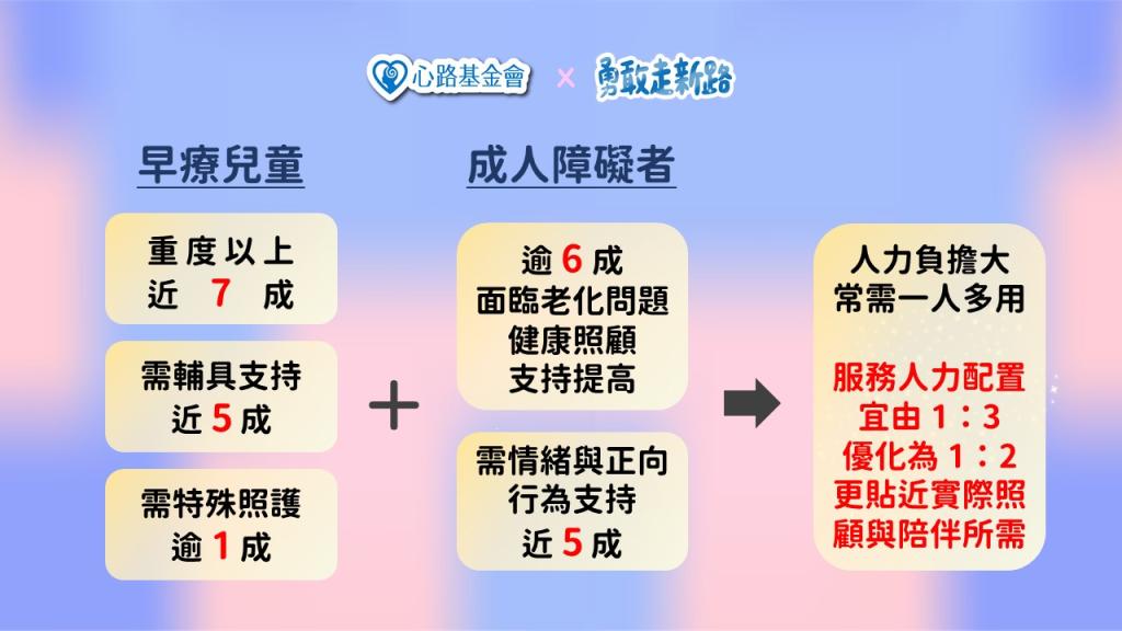 心路基金會指出,近年早療中心重度以上障礙兒童比例已逼近七成,約半數需使用多種輔具,如餵食椅、站立架、推車與助行器等。教保員每日協助孩子上下輔具,幾乎占去三分之一工時,長期搬抱造成職業傷害,輔具汰換費用亦逐年上升。另約有一成孩子有癲癇、血氧驟降等緊急狀況,各中心平均每半年需急救送醫一至兩次,考驗第一線人員的專業與臨場應變能力。成人機構則面臨障礙者老化與情緒行為支持的雙重挑戰,人員負擔加重,已是這幾年服務現場的日常。目前心路的人力與訓練支出占整體經費八成;雖有政府補助,每年仍須自籌約 1 .3億元;但因景氣低迷導致捐款減少,年底前尚有4,000萬元缺口,心路呼籲社會大眾共同支持,讓照顧不中斷。