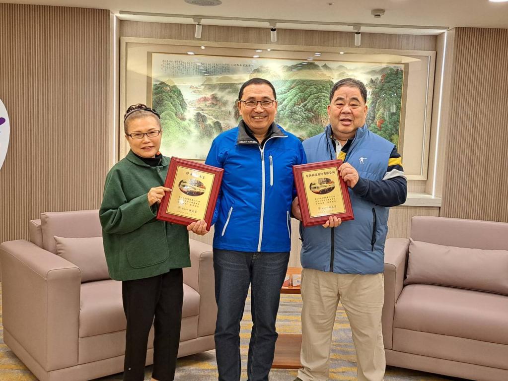 圖說:侯友宜市長回贈感謝牌給智英科技董事長林宴臨夫婦。