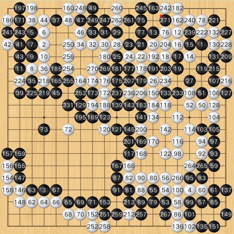 戰至第271手時,白棋的落後幅度約4.5目到5.0目。此時盤面已無可爭之處,最終結果為黑中盤勝。