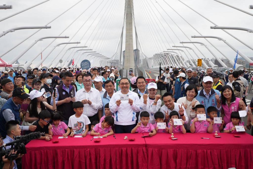 不對稱的斜張橋則是採雲門舞集律動的意象,是全世界跨距最大的,達到四百五十公尺,是台灣一個國際最重要的地標。不論坐飛機出國或是回來,從飛機上就可以看到淡江大橋,就像回到母親的懷抱。侯友宜除感謝中央與地方一起合作,不分你我,也希望大家同心協力,為這塊土地為台灣努力。