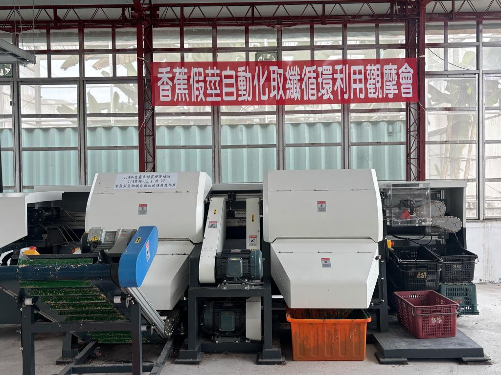 農糧署說明,臺灣香蕉收穫面積約14,000公頃以上,農友們在採收香蕉後,往往留下更大量香蕉假莖副產物,過去常被視為廢棄物,然而香蕉假莖富含可循環利用且深具減碳效益之天然纖維,未善加利用殊為可惜;為了建立香蕉假莖循環利用模式,該署與蕉研所合作開發適當田間栽培管理模式及假莖省工採收方法,並且輔導設置首座區域型香蕉假莖自動化取纖循環場,透過自動化取纖設備,將能快速且穩定生產高品質香蕉纖維,有助於提升香蕉假莖纖維織品之能見度。